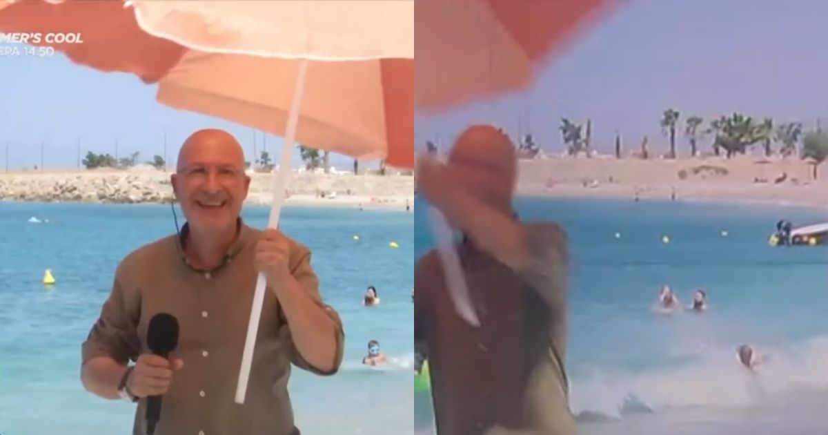 Την ώρα που ήταν σε ζωντανή σύνδεση με το στούντιο των Δεκατιανών και ενώ κρατούσε στα χέρια του ομπρέλα θαλάσσης, ένα αεράκι τον παρέσυρε λίγο πιο πέρα.
