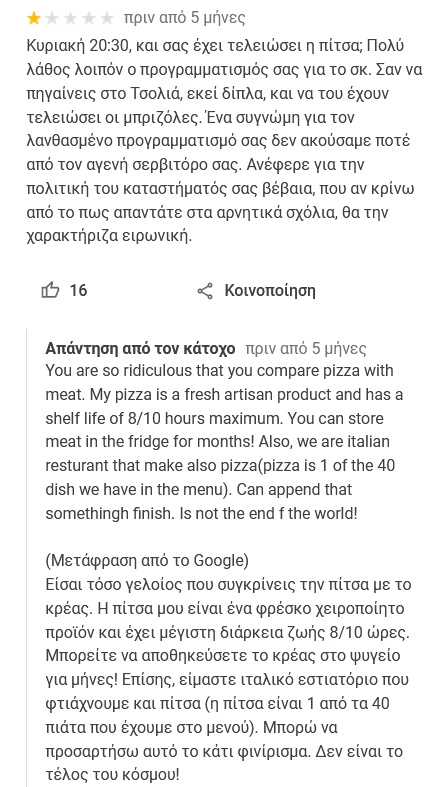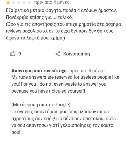 Τι σημαίνει αυτό; Συνήθως όταν κάποιος πελάτης αφήνει αρνητικά σχόλια σε κάποια επιχείρηση, οι ιδιοκτήτες της είτε το αγνοούν, είτε προσπαθούν ευγενικά -αφού ζητήσουν συγγνώμη- να απαντήσουν στα παράπονα των δυσαρεστημένων πελατών.