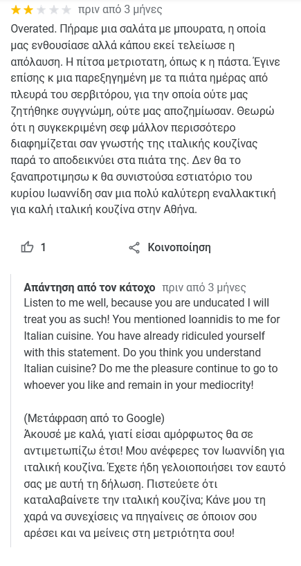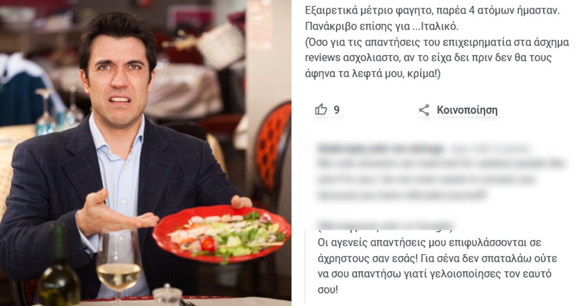 Τί κι αν ο πελάτης έχει πάντα δίκιο; Ο συγκεκριμμένος ιδιοκτήτης εστιατορίου τα βάζει μαζί τους με το που τολμήσουν να γράψουν κάποιο κακό σχόλιο ή κριτική για το μαγαζί του. Δεν διστάζει δε, να τους απειλήσει πως θα τους βρει και θα τους δείρει.