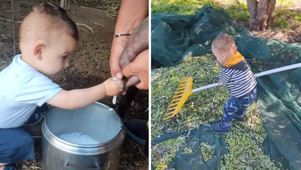 Μαζεύει ελιές και αρμέγει ο 2χρονος Στέλιος από την Κρήτη
