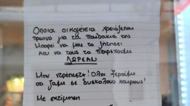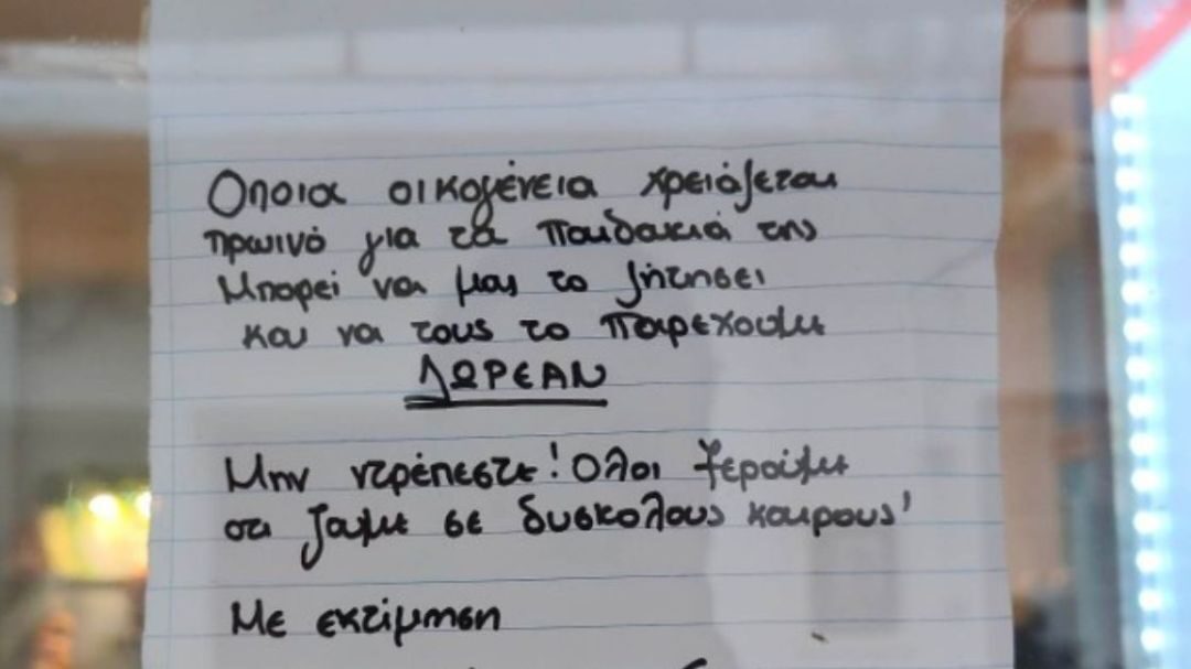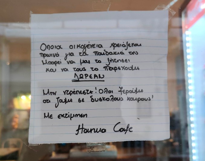 Όπως, για παράδειγμα, αν περάσει κανείς έξω από ένα μαγαζί στην παλιά πόλη του Ρεθύμνου και διαβάσει το σημείωμα που υπάρχει στην πόρτα θα σκεφτεί ακριβώς αυτό: ότι δεν έχει χαθεί κάθε ελπίδα και υπάρχει ανθρωπιά και αλληλεγγύη στις μέρες μας. Το μαγαζί προσφέρει δωρεάν πρωινό σε όσες οικογένειες έχουν ανάγκη και δεν μπορούν να το παρέχουν στα παιδιά τους.