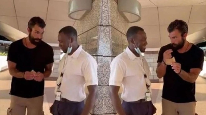 Στο βίντεο φαίνεται ο ίδιος να πλησιάζει έναν ντόπιο. Αφού πρώτα τον χρηματίζει στη συνέχεια του λέει «today food καλύβα» και φεύγει τρέχοντας.