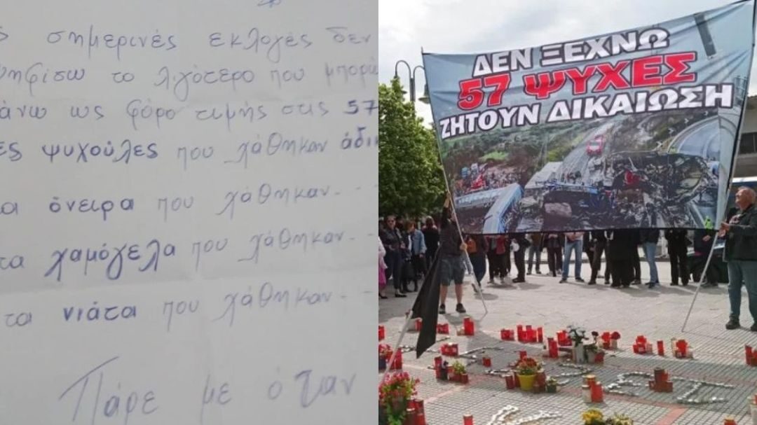 «Στις σημερινές εκλογές δε θα ψηφίσω, το λιγότερο που μπορώ να κάνω ως φόρο τιμής στις 57 αθώες ψυχούλες που χάθηκαν άδικα. Στα όνειρα που χάθηκαν, στα χαμόγελα που χάθηκαν, στα νιάτα που χάθηκαν. Πάρε με όταν φτάσεις…».