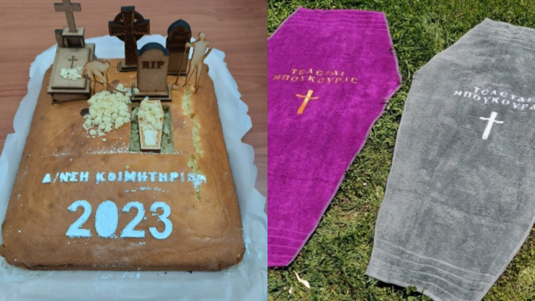 Έτσι λοιπόν όλοι οι παρευρισκόμενοι έμειναν άφωνοι όταν αντίκρισαν το… καλλιτεχνικό αποτέλεσμα που εμπνεύστηκαν οι υπεύθυνοι των Κοιμητηρίων! Η βασιλόπιτα ήταν ένα… νεκροταφείο και πάνω σε αυτή απεικονίζονταν ένας τάφος με τη χρονολογία 2023, δύο νεκροθάφτες, ένα φέρετρο και ένας λάκκος! Μάλιστα οι νεκροθάφτες έσκαβαν τον λάκκο, ο οποίος αποτελούνταν από τα ψίχουλα της βασιλόπιτας!