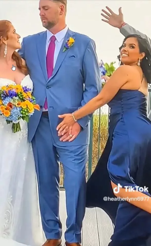 Συγκεκριμένα, σε ένα βίντεο που ανάρτησε στο TikTok και έχει συγκεντρώσει πάνω από 18 εκατομμύρια προβολές – το διέγραψε πλέον – η νύφη και ο γαμπρός κοιτάζονται στα μάτια, με την παράνυμφο να έχει το χέρι της ακριβώς δίπλα στον καβάλο του γαμπρού. Σε μια άλλη, έχει περασμένο το χέρι της στο μπράτσο του γαμπρού και σε άλλη, τον κρατά σφιχτά.