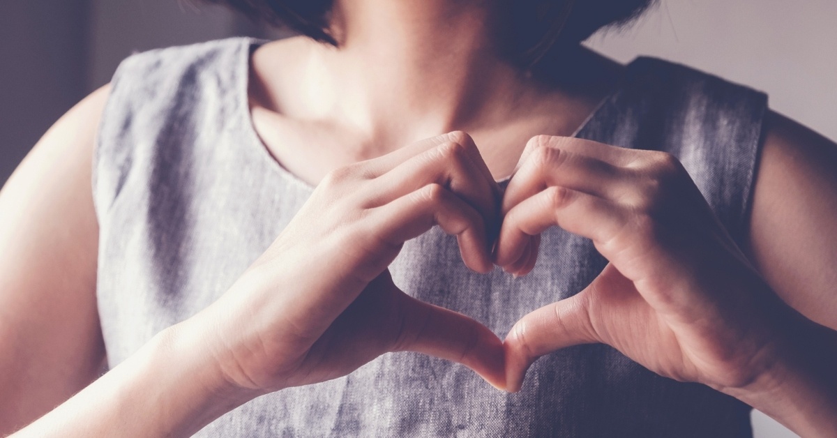 Happy Asian young woman making her hands in heart shape, heart health insurance, social responsibility, donation charity concept, world heart day