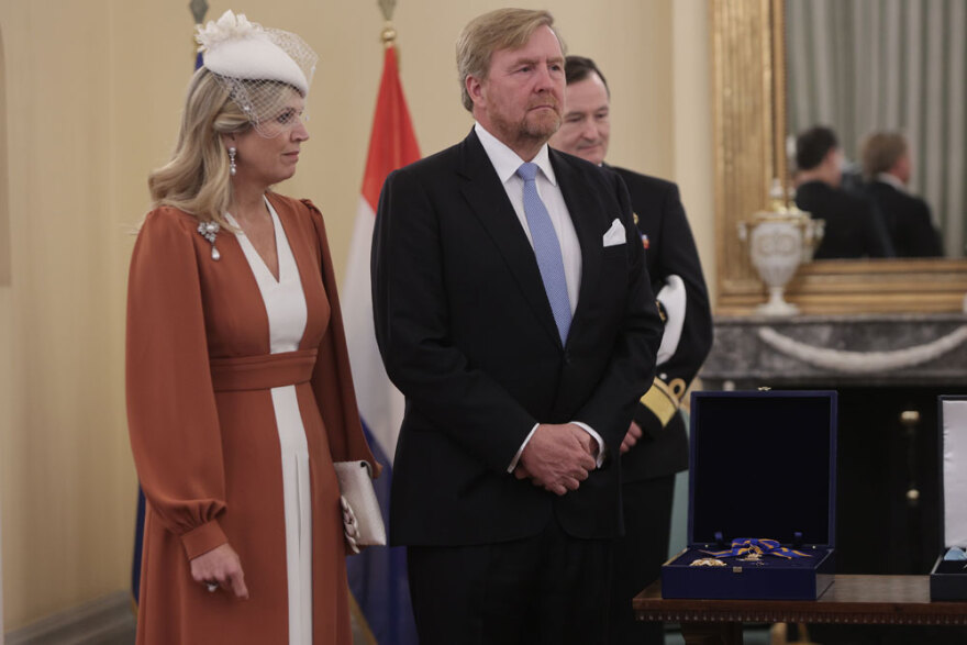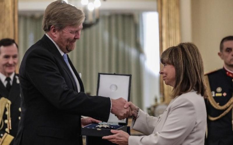 Νωρίτερα, η Πρόεδρος της Δημοκρατίας, σε ειδική τελετή στο Προεδρικό Μέγαρο, απένειμε στον Βασιλιά και στη Βασίλισσα της Ολλανδίας το Παράσημο του Μεγαλόσταυρου του Τάγματος του Σωτήρος.