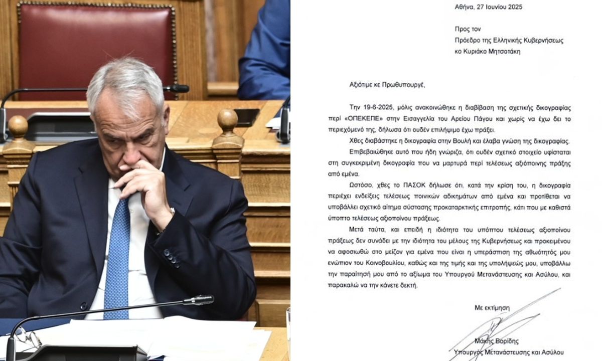Ανακοινώνεται ότι ο Υπουργός Μετανάστευσης και Ασύλου Μάκης Βορίδης υπέβαλε την παραίτησή του στον Πρωθυπουργό, για τους λόγους που αναφέρονται στην επιστολή και η οποία επισυνάπτεται. Ο Πρωθυπουργός έκανε δεκτή την παραίτησή του.