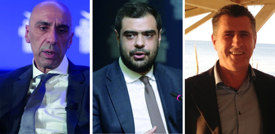 Από αριστερά: Ο υφυπουργός παρά τω πρωθυπουργώ Γιάννης Μπρατάκος, ο γραμματέας της Ν.Δ. Παύλος Μαρινάκης και ο σύμβουλος του κ. Μητσοτάκη και πολύπειρος περί τα κομματικά, Θανάσης Νέζης
