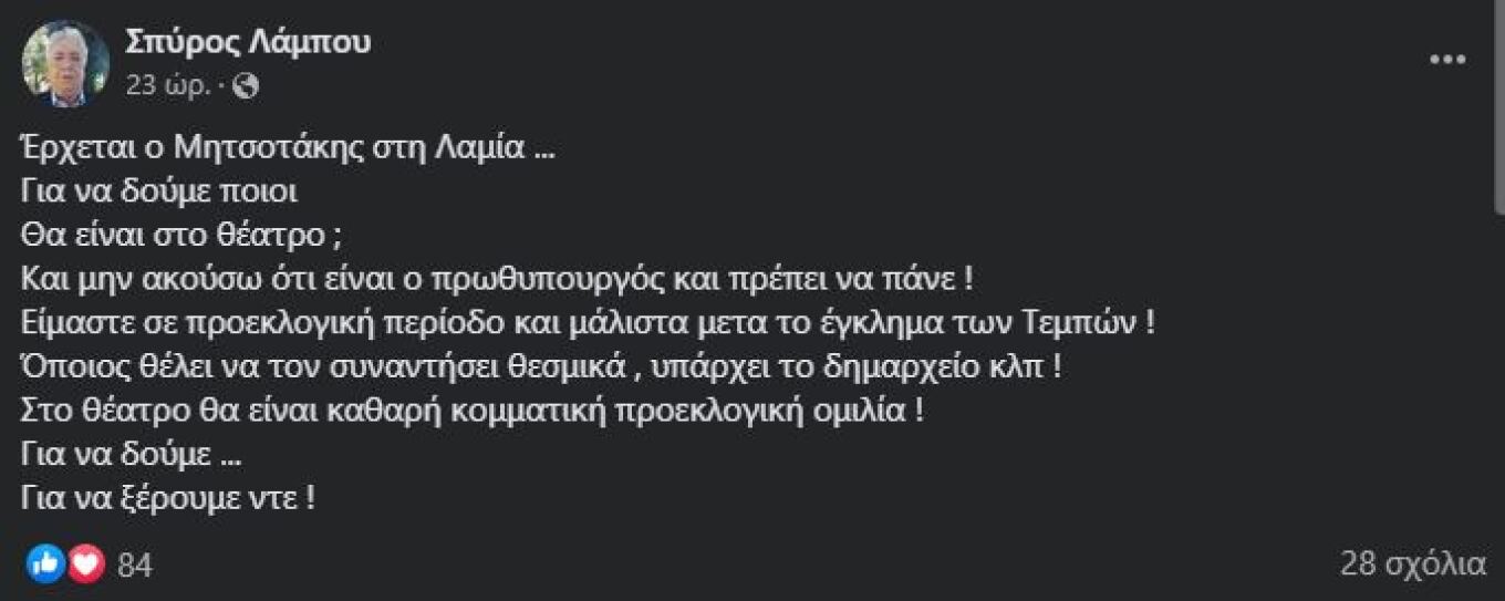 Συγκεκριμένα, ο περιφερειακός σύμβουλος του συνδυασμού «Στερεά… Υπεροχής!» Σπύρος Λάμπου έγραψε στο προφίλ του στο Facebook: