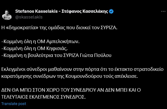 Να σημειωθεί πως προηγήθηκε σχετική ανάρτηση από τον Στέφανο Κασσελάκη στα social media μέσω της οποίας ανέφερε ότι «Εκλεγμένοι σύνεδροι μαθαίνουν στην πόρτα ότι το έκτακτο στρατοδικείο καρατόμησης συνέδρων της Κουμουνδούρου τούς απέκλεισε».