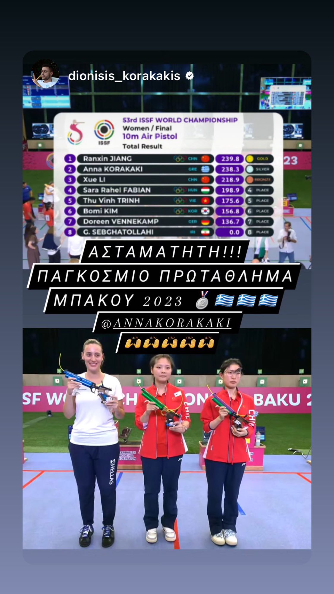 🥈 Aργυρή Παγκόσμια Πρωταθλήτρια η Άννα Κορακάκη. Η Ολυμπιονίκης της σκοποβολής κατέκτησε το αργυρό μετάλλιο στο Παγκόσμιο Πρωτάθλημα του Μπακού στο αεροβόλο πιστόλι των 10μ., μένοντας πίσω μόνο από την Κινέζα, Ζιανγκ. Πολλά συγχαρητήρια, Άννα