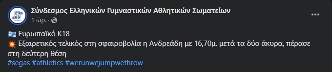 Για την Ανδρεάδη η διαδικασία αποδείχθηκε αρκετά εύκολη, αφού στην πρώτη της βολή πέτυχε 17,37 μ. και αποχώρησε από τον αγωνιστικό χώρο με την καλύτερη επίδοση στο σύνολο των δύο γκρουπ. Η αθλήτρια του Τάκη Ανυφαντή έχει ατομικό ρεκόρ 17,76 μ. και είναι από τις αθλήτριες που θα διεκδικήσουν τη διάκριση.