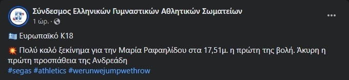 Πολύ καλό ξεκίνημα για την Μαρία Ραφαηλίδου στα 17,51μ. η πρώτη της βολή. Άκυρη η πρώτη προσπάθεια της Ανδρεάδη