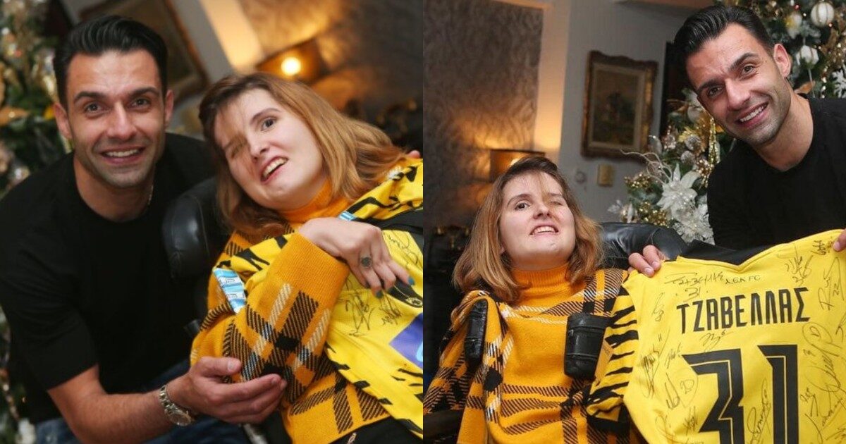 “Μια ξεχωριστή επίσκεψη πραγματοποίησε σήμερα το μεσημέρι ο Γιώργος Τζαβέλλας. Ο διεθνής άσος της ΑΕΚ, εκπροσωπώντας όλους τους συμπαίκτες του, τήρησε την υπόσχεση που είχε δώσει στη Μυρτώ έπειτα από το παιχνίδι με τον Ιωνικό στην OPAP ARENA και βρέθηκε στο σπίτι της, στο Μαρούσι, όπου συνομίλησε για αρκετή ώρα με εκείνη και τη μητέρα της και της παρέδωσε μια φανέλα με τις υπογραφές όλων των παικτών της ομάδας μας, αλλά και με μια δική του ιδιόχειρη αφιέρωση”, ανέφερε χαρακτηριστικά η ΑΕΚ στα social media.