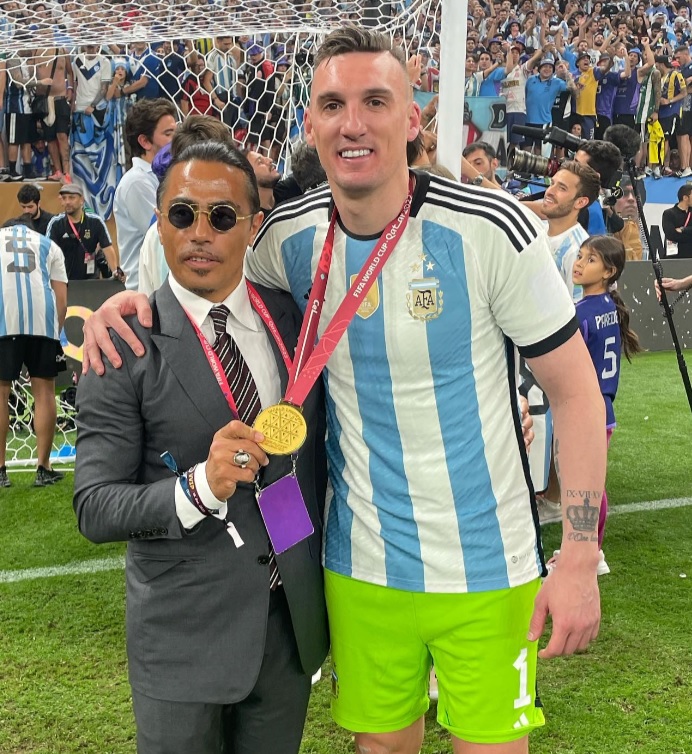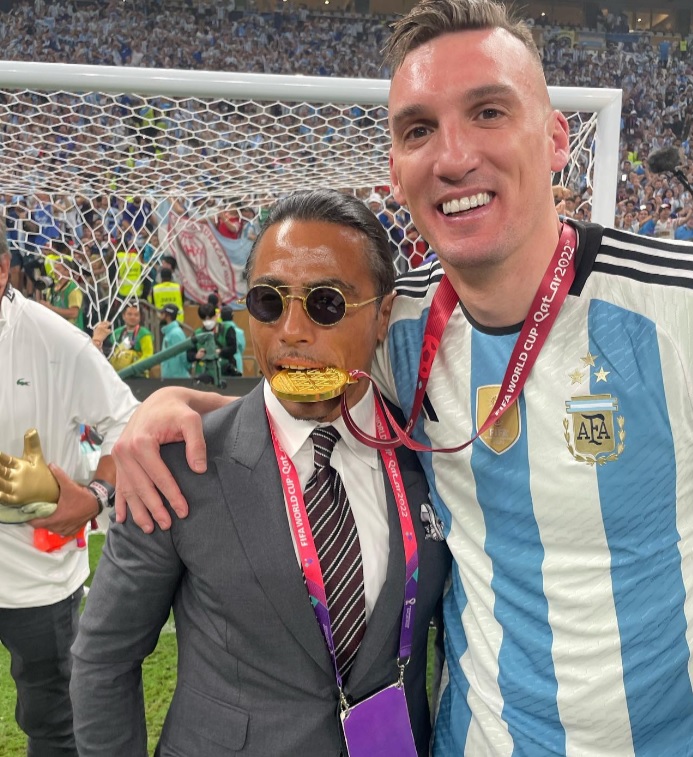 Στον αγώνα του αιώνα, η Αργεντινή νίκησε 4-2 στα πέναλτι την δύο φορές πρωταθλήτρια Γαλλία στον τελικό του Παγκοσμίου Κυπέλλου 2022 την Κυριακή (18/12). Ο αρχηγός της ομάδας Λιονέλ Μέσι έγινε ο πρώτος παίκτης της ομάδας που έπιασε στα χέρια του το τρόπαιο του Παγκοσμίου Κυπέλλου και το σήκωσε στον ουρανό. Ωστόσο, υπήρχαν και κάποιοι άλλοι, οι οποίοι θέλησαν να αγγίξουν το τρόπαιο και να γίνουν μέρος της ιστορικής στιγμής. Και, φυσικά, αναφερόμαστε στον πασίγνωστο σεφ, – και στην Ελλάδα από την εμφάνισή του στο Survivor – Salt Bae, που είναι γνωστός για τη χαρακτηριστική κίνηση που κάνει όταν βάζει αλάτι στο φαγητό αλλά και τις…χρυσές μπριζόλες.