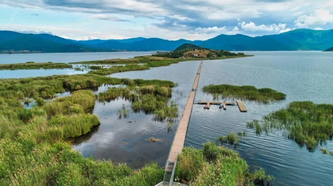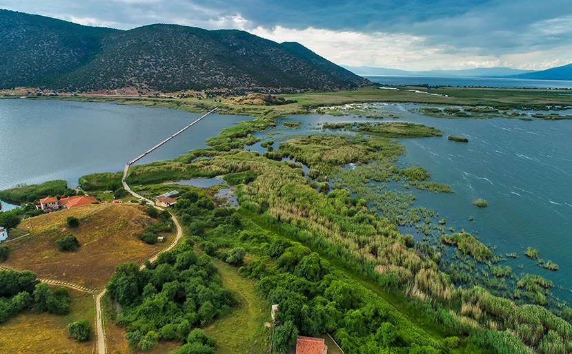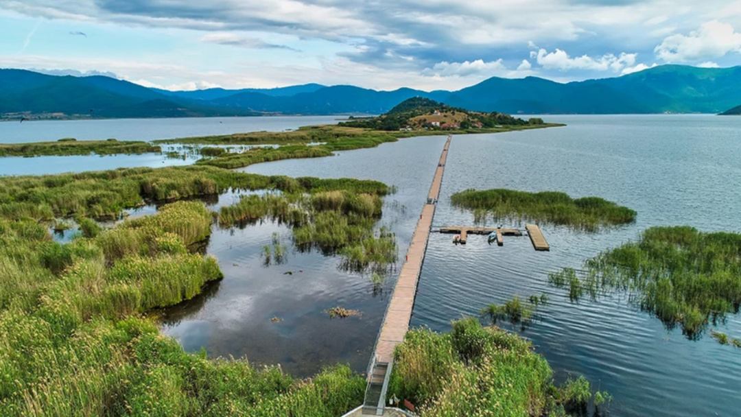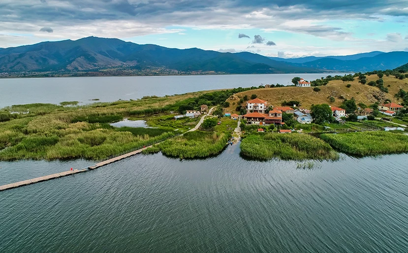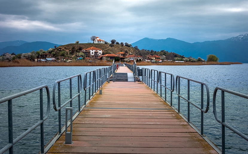 Μία από τις πιο χαρακτηριστικές εικόνες, λοιπόν, που αντικρίζει ο επισκέπτης της περιοχής, είναι η ξύλινη γέφυρα που οδηγεί στο νησάκι του Αγίου Αχιλλείου, το οποίο μοιάζει να πλέει στα νερά της Μικρής Πρέσπας.