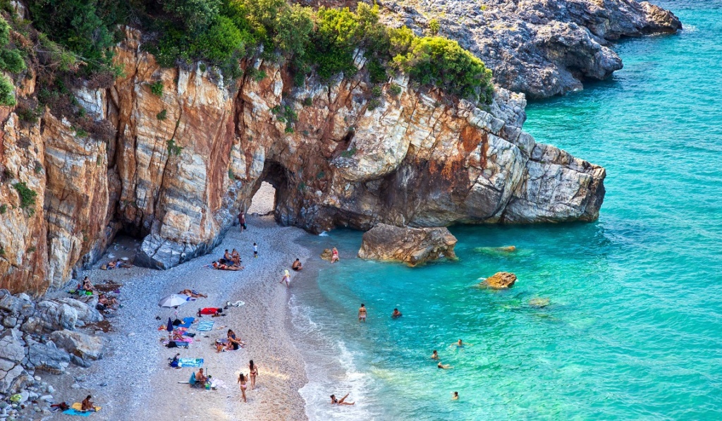 Ένας πελώριος βράχος στέκει αγέρωχος, χωρίζοντας την παραλία στα δύο, δημιουργώντας μια γοητευτική διαμπερή σπηλιά. Για όσους αναζητούν δροσερές βουτιές σε συνδυασμό με κοσμοπολίτικη ατμόσφαιρα, το beach bar προσφέρει δροσιστικά cocktails και χαλαρωτική μουσική.