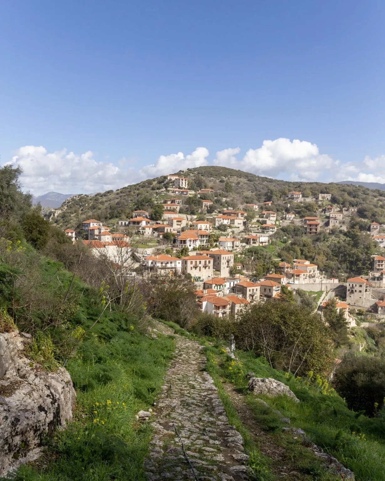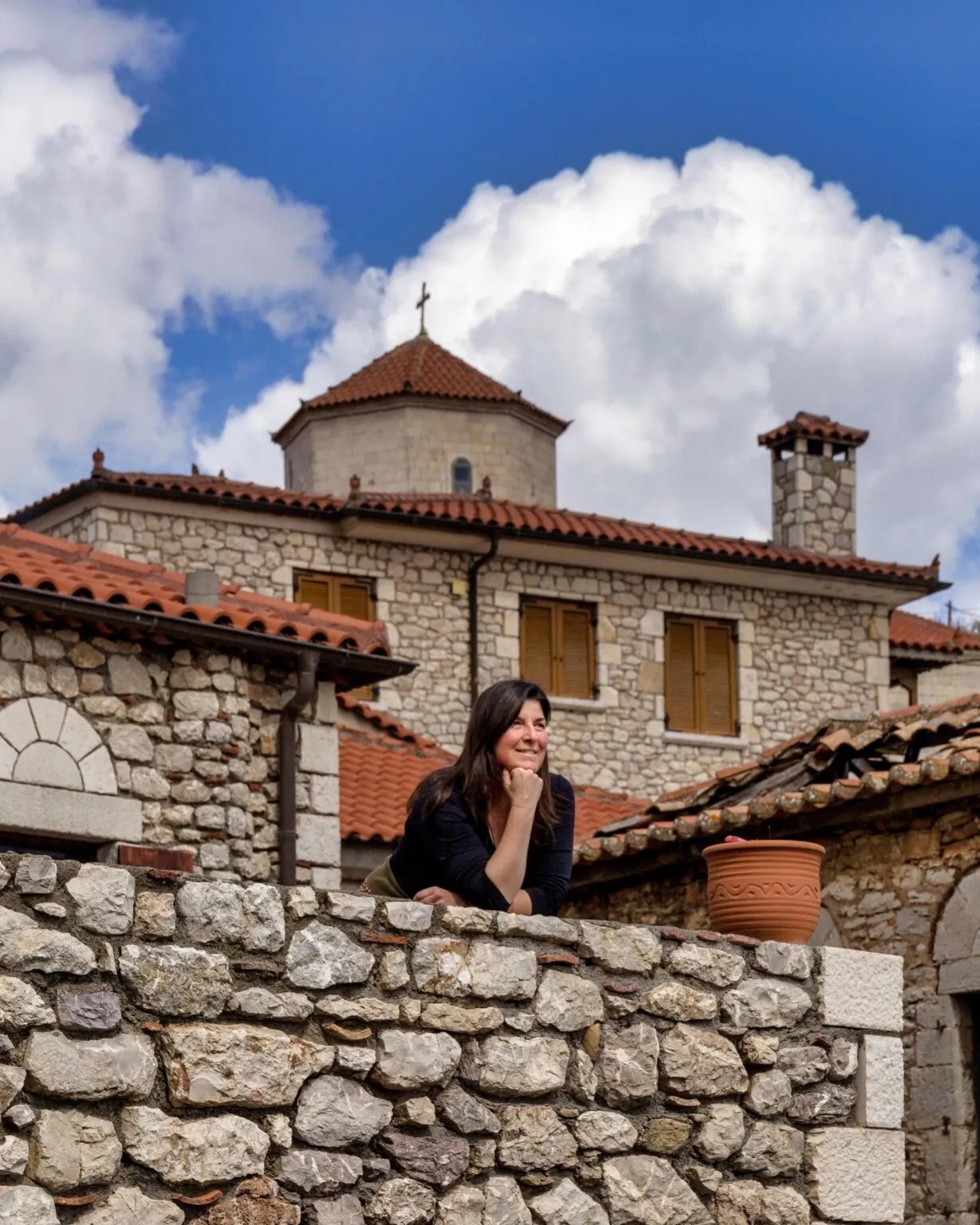 Είναι μεσημέρι και στο λιθόστρωτο κεντρικό στενό της Καρύταινας το μικρό παντοπωλείο της Κυριακής είναι κλειστό. Η Ελένη Κουσκουρέλου με περιμένει στη διασταύρωση, το ραντεβού είναι στο όμορφο πέτρινο σπίτι κάτω από το κάστρο, όπου ζει μαζί με την οικογένειά της.