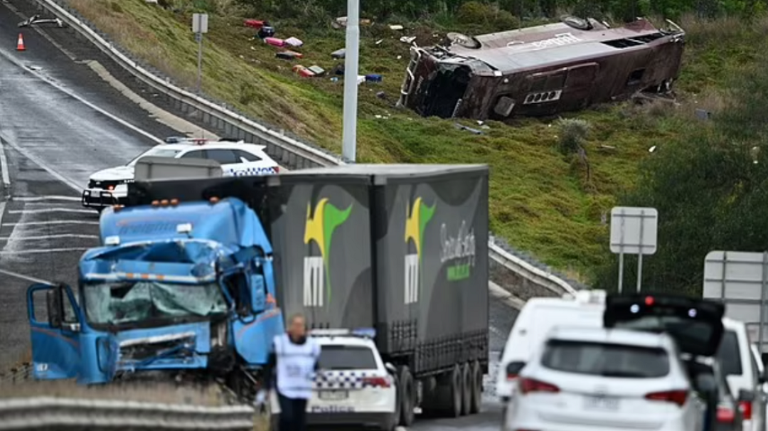 Το λεωφορείο που μετέφερε 27 μαθητές και τέσσερις ενήλικες κατρακύλησε για περίπου 20 μέτρα και κατέληξε σε χωράφι αφότου συγκρούστηκε με το φορτηγό στην περιοχή Bacchus Marsh στις 03:15 τα ξημερώματα.