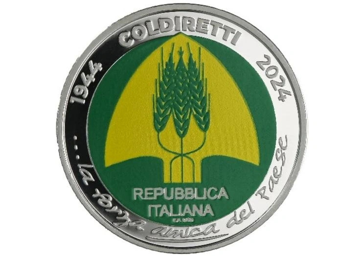 Κατασκευασμένο από proof silver από τον καλλιτέχνη χαράκτη Emanuele Ferretti, το κέρμα διαθέτει ένα σχέδιο πλούσιο σε νόημα. Στην εμπρόσθια όψη του νομίσματος, στο κέντρο, ξεχωρίζει το λογότυπο Coldiretti: ένα κίτρινο φτυάρι σε πράσινο φόντο, ένα αδιαμφισβήτητο σύμβολο της γεωργίας, το οποίο περικλείει τρία αλληλένδετα στάχυα, που αντιπροσωπεύουν την παράδοση και τη γονιμότητα της γης.