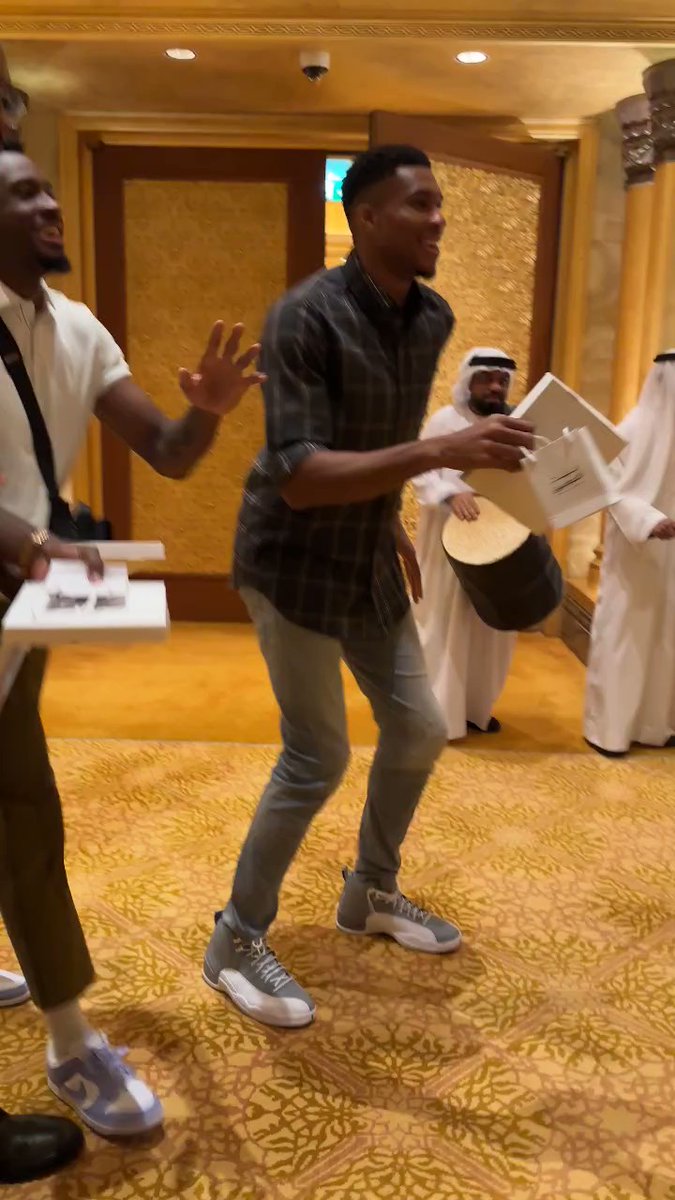 Μάλιστα, σε βίντεο που ανέβασε ο ίδιος στα social media, περπατάει σε μια αίθουσα μαζί με τον αδερφό του Θανάση Αντετοκούνμπο και τον συμπαίκτη τους στους Μιλγουόκι Μπακς, Σερτζ Ιμπάκα, όπου ακούγονται κρουστά. Ο Γιάννης Αντετοκούνμπο δεν αντιστάθηκε κι έδειξε μερικές χορευτικές φιγούρες.