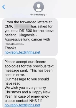 Το λάθος κείμενο έλεγε στους παραλήπτες ότι «είχαν επιθετικό καρκίνο του πνεύμονα με μεταστάσεις», ένα είδος δευτερογενούς κακοήθους ανάπτυξης. Μάλιστα καθοδηγούσε τους ασθενείς να συμπληρώσουν το έντυπο DS1500, το οποίο επιτρέπει σε άτομα με ανίατες ασθένειες να διεκδικήσουν ορισμένα επιδόματα.