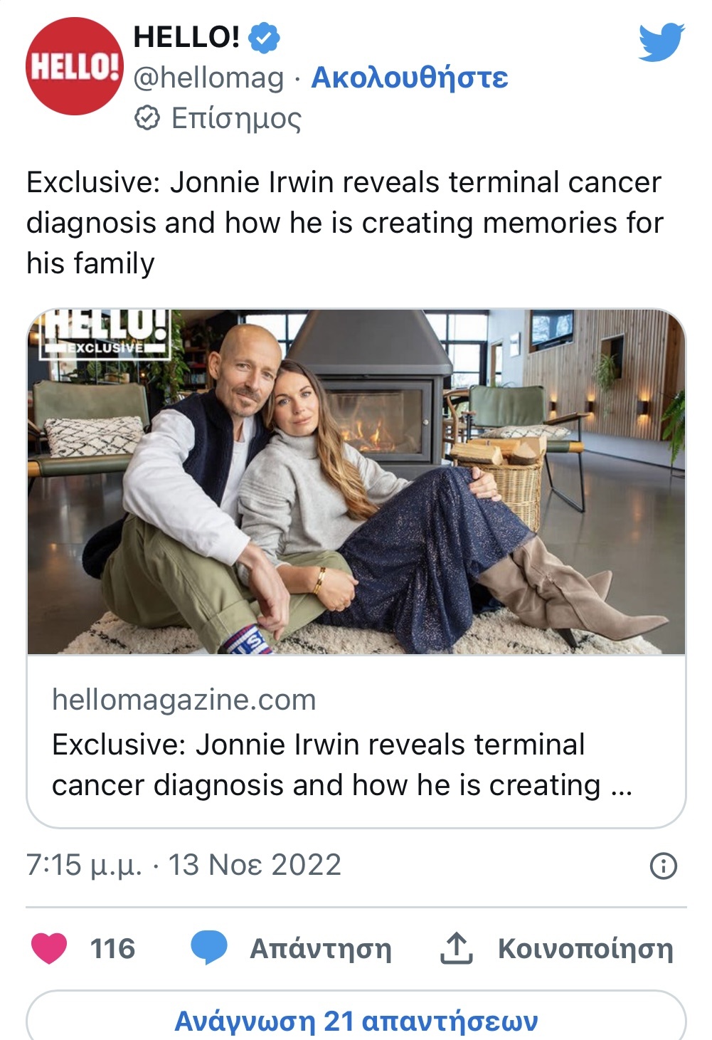 Η ιστορία του δημοφιλούς παρουσιαστή της βρετανικής τηλεόρασης που πάσχει από καρκίνο σε τελικό στάδιο συγκινεί και αφυπνίζει. Ο 48χρονος Τζόνι Ίρβιν έδωσε μια εκ βαθεών συνέντευξη στο περιοδικό Hello. Μίλησε για την ασθένειά του, την οικογένεια που έχει δημιουργήσει με την 40χρονη σύντροφό του, Τζέσικα, και τα τρία αγόρια τους.