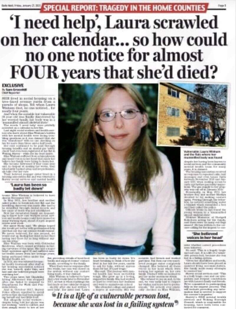 Κανένας από τις κοινωνικές υπηρεσίες στην περιοχή ή από την ομάδα των γιατρών που την παρακολουθούσαν δεν ενδιαφέρθηκε για την περίπτωσή της της Λόρα Γουίνχαμ που βρέθηκε νεκρή στα 38 της στο μικρό διαμέρισμα όπου ζούσε στο Γουόκινγκ του Σάρεϊ.