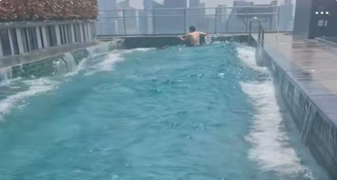 Ο άνδρας που βρισκόταν μέσα σε μια πισίνα στο ρετιρέ ενός κτιρίου στο Μπανγκόγκ της Ταϊλάνδης, καταγράφηκε να προσπαθεί να κρατηθεί για να μην παρασυρθεί από τα νερά.