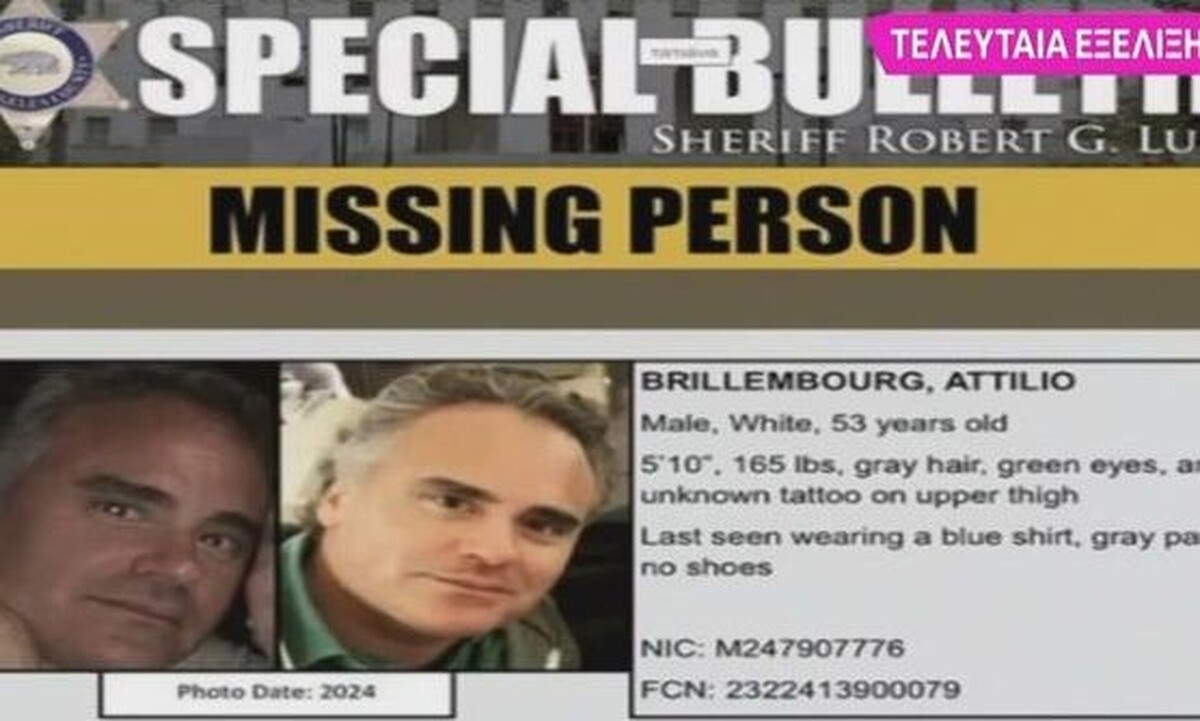 Ο 53χρονος σύμφωνα με την ειδοποίηση της εξαφάνισης Brillembourg, έχει πράσινα μάτια, γκρίζα μαλλιά, ύψος 1,80 μ., ζυγίζει 75 κιλά κι έχει ένα τατουάζ στον μηρό του.