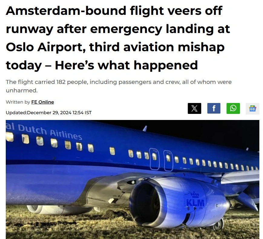 Όπως αναφέρει η Financial Express άλλο ένα αεροπορικό συμβάν σημειώθηκε σήμερα στη Νορβηγία. Ένα Boeing 737-800 της KLM Royal Dutch Airlines αναγκάστηκε να πραγματοποιήσει αναγκαστική προσγείωση στο αεροδρόμιο Thorp Sandefjord του Όσλο λόγω βλάβης στο υδραυλικό σύστημα.